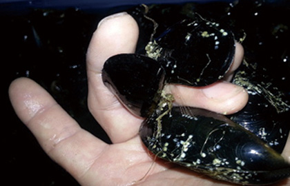 Pre-removal of fine fbyssus and suspended solids left on the surface of mussels prior to screening to eliminate marine pollutants generated during distribution while efficiently conducting inspection, packaging and processing steps.